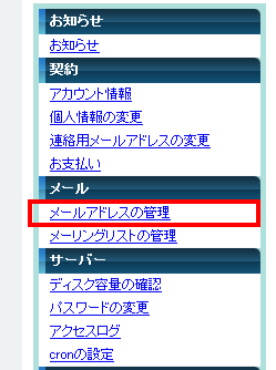 1.コントロールパネルのメニューからメールアドレスの管理のリンクをクリック