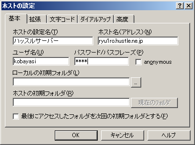 | ホストの設定名(T) | 設定の名前です。「ハッスルサーバー」と入力します |