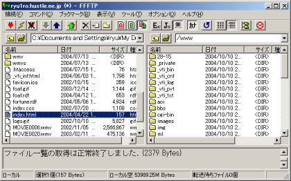 左側がパソコンにあるフォルダ、ファイルが表示されます。右側が、ハッスルサーバー内にあるフォルダ、ファイルが表示されます。ファイルをアップロードするには、左のアイコンを選択して、↑のボタンを押すか、左から右へドラッグアンドドロップします。
