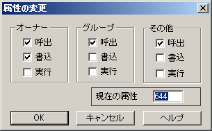 ファイルをアップロードしたら、属性の変更を忘れずにしましょう。右のファイルやディレクトリを右クリックすると、「属性の変更」というメニューがあるので、これを選択してください。すると上のような画面が現れ、属性の変更ができます。