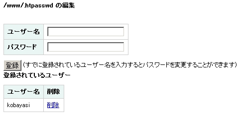 パスワードファイルを編集すると、/ に .htpasswd というファイルが作成されます。 このファイルは、パスワードを記録するために必要なファイルですので、 削除、編集をしないようにしてください。