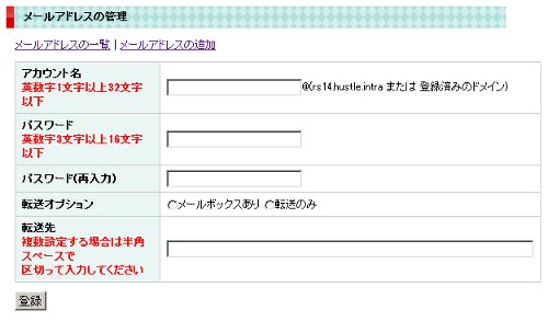 転送先には、転送先のメールアドレスを入力します。メールボックスありでも指定することができます。複数指定したい場合は、半角空白で区切って入力します。転送をしない場合は、何も入力しません。