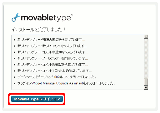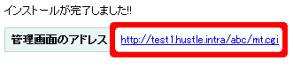 これでインストールは完了です!管理画面のアドレスが表示されますが、今後再度表示されませんので、ブックマークなどしておいてください。引き続き、MovableType上でのインストール作業が続きますので、管理画面のアドレスをクリックしてください。