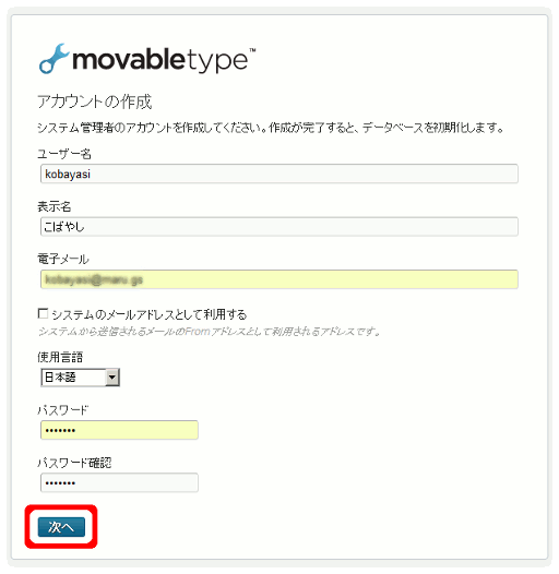 | パスワード | インストール後にMovable Typeにログインするときに必要になるので、忘れないようにしてください。 |