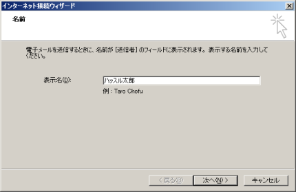 名前を入力します。この名前が相手のメールソフトに表示されますので、好きな表記で入力できます。