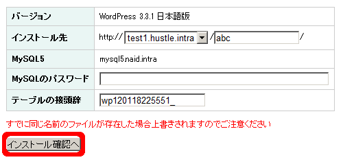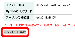 | インストール先 | ご希望のインストール先を入力します。例: http://test.hustle.ne.jp/abc/ |