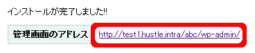 これでインストールは完了です!管理画面のアドレスが表示されますが、今後再度表示されませんので、ブックマークなどしておいてください。引き続き、WordPress上でのインストール作業が続きますので、管理画面のアドレスをクリックしてください。
